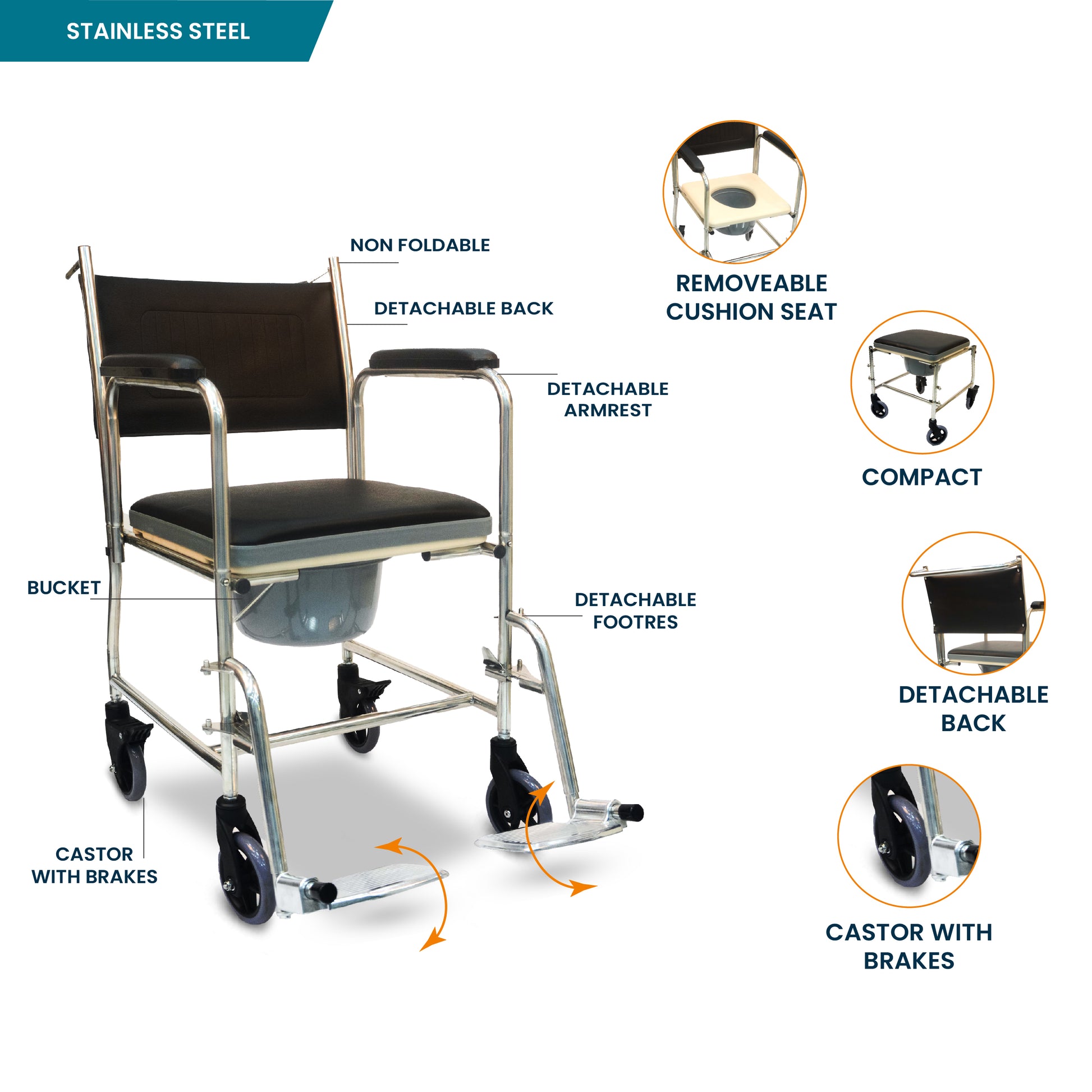 This wheelchair, with an attached pot, removable commode PU seat, solid castors with brakes, and detachable footrests, armrests, and back, offers a comprehensive and user-friendly solution with a focus on convenience, safety, and adaptability for users with specific needs.