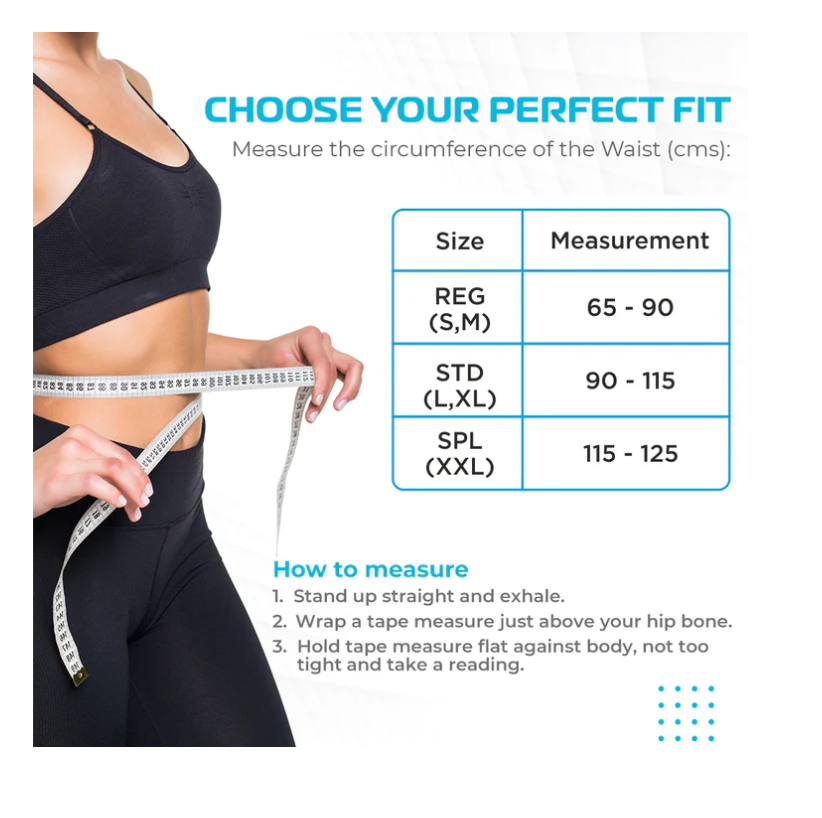 Position the belt centrally behind the back and a little above the buttocks. Wrap the belt around the waist and Velcro close it without applying pressure on the abdomen. Adjust the pressure pads as desired for better comfort and on sore or inflamed areas. Pull the lace till the required compression is reached and then Velcro fix the lace handle. Usage: Wear the belt for up to 2 hours initially and can be extended longer depending on the need.