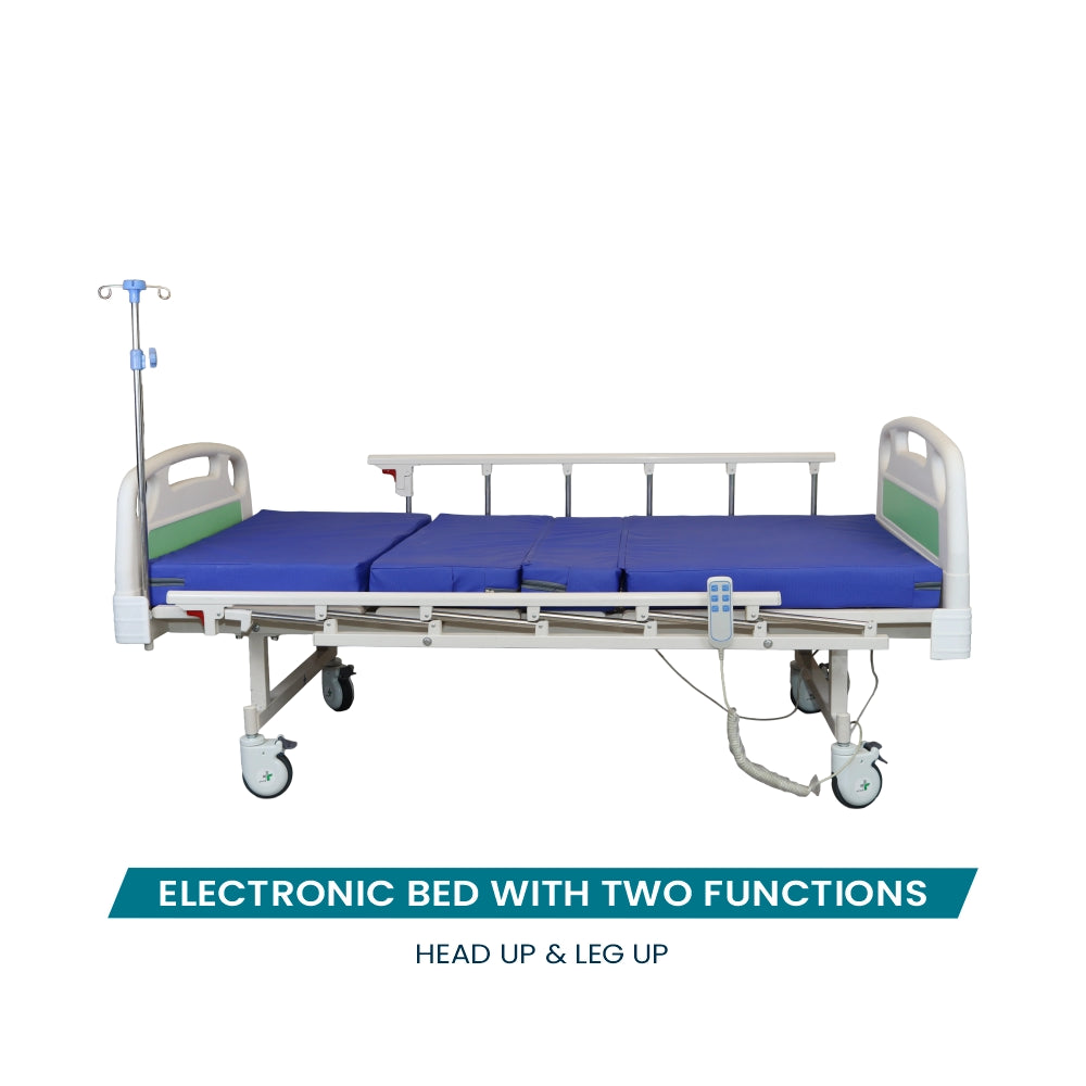 The ARREX THEO Bed is a hospital-grade bed designed for comfort and adjustable convenience, featuring electronic 2-function movement, side railings, saline rod, mattress, and urnie hook. The remote control adjusts the bed to your preferred position, while the included mattress offers extra support and helps to reduce pressure points. Enjoy superior comfort every time you rest.