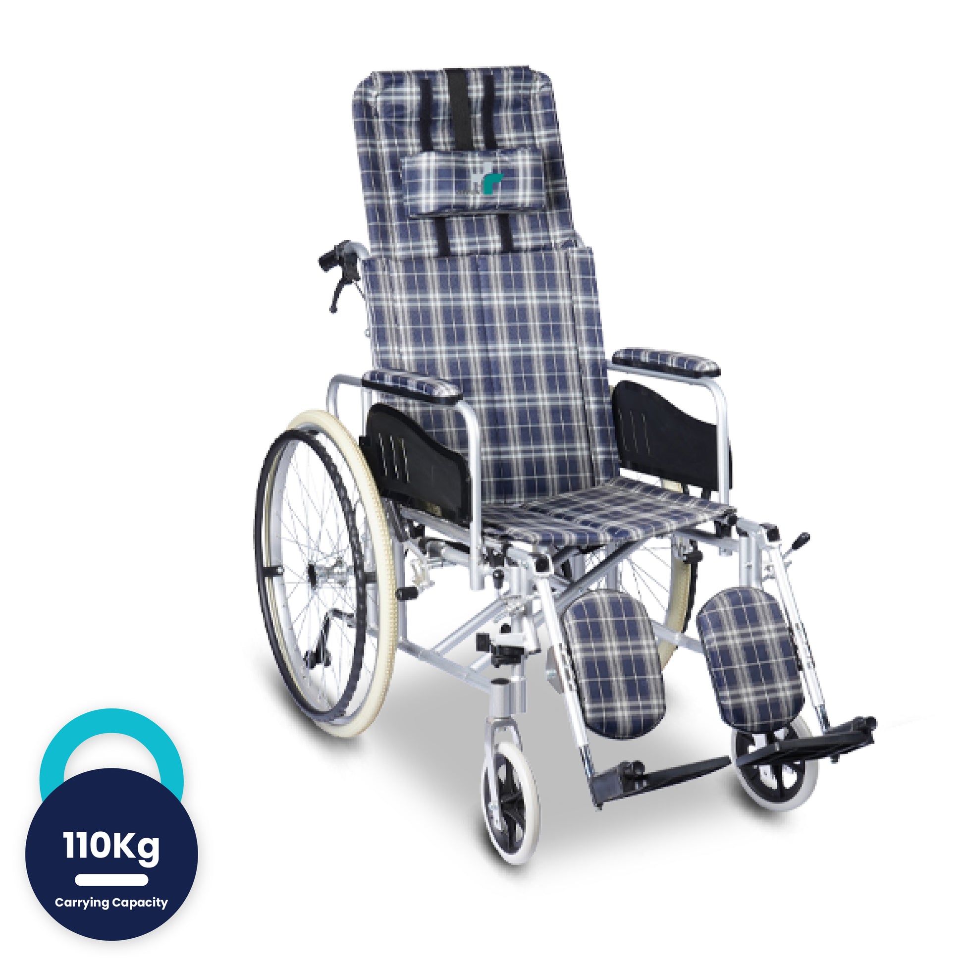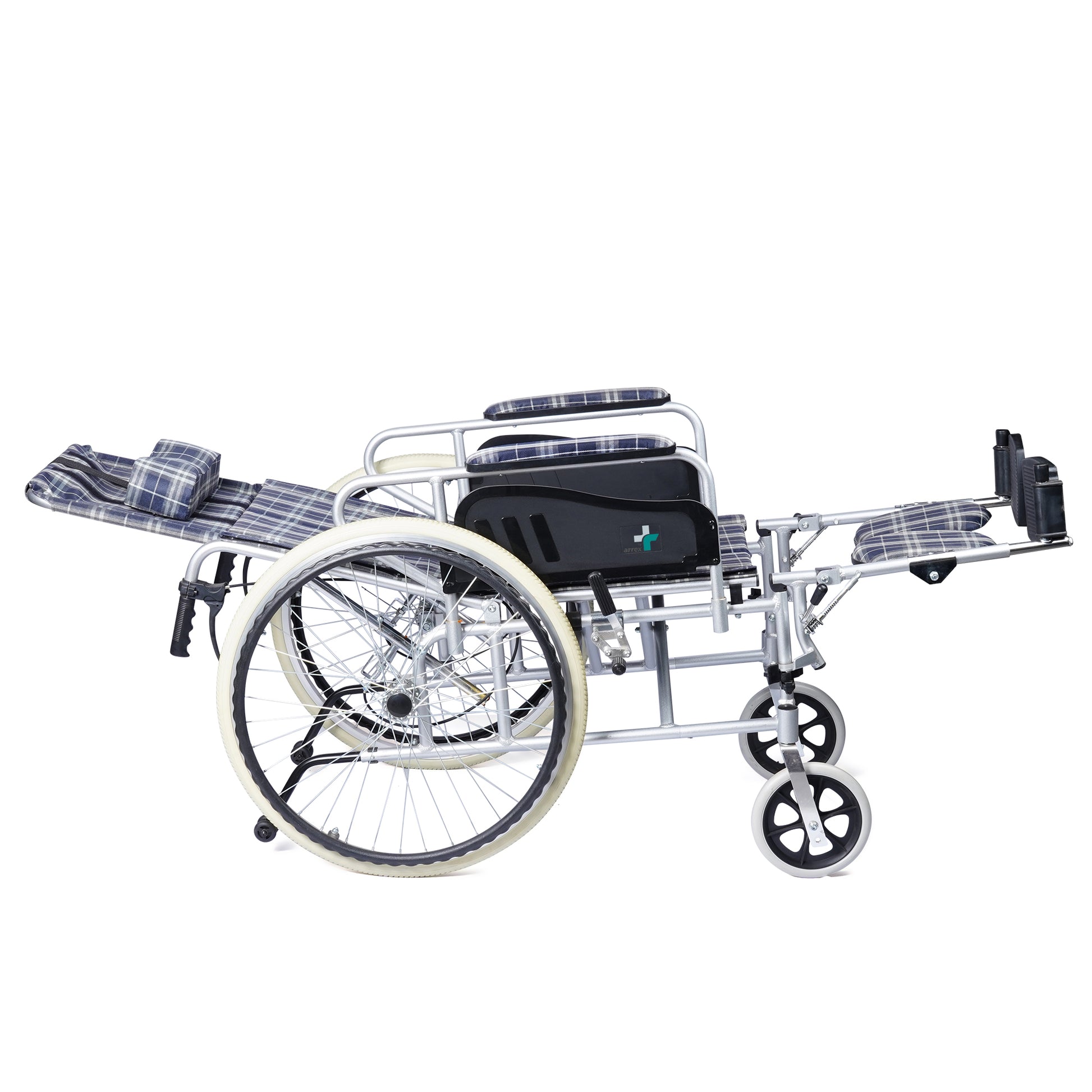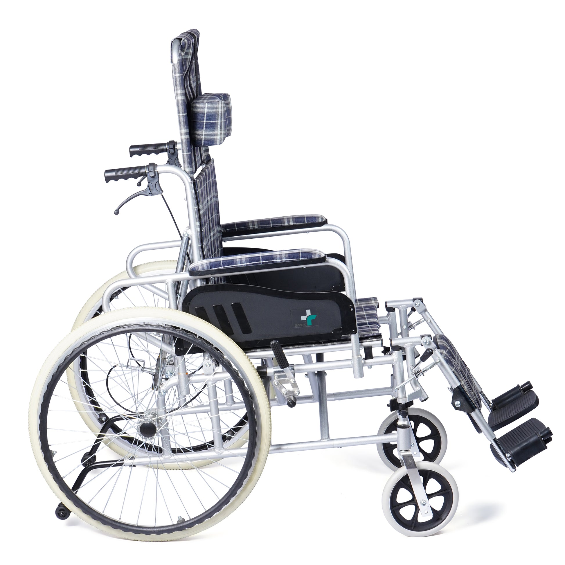 - The wheelchair features a reclining backrest, allowing users to adjust their seating position for added comfort.