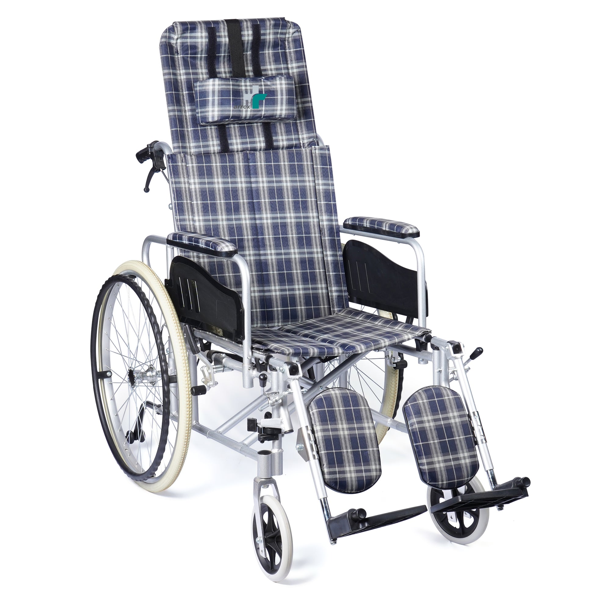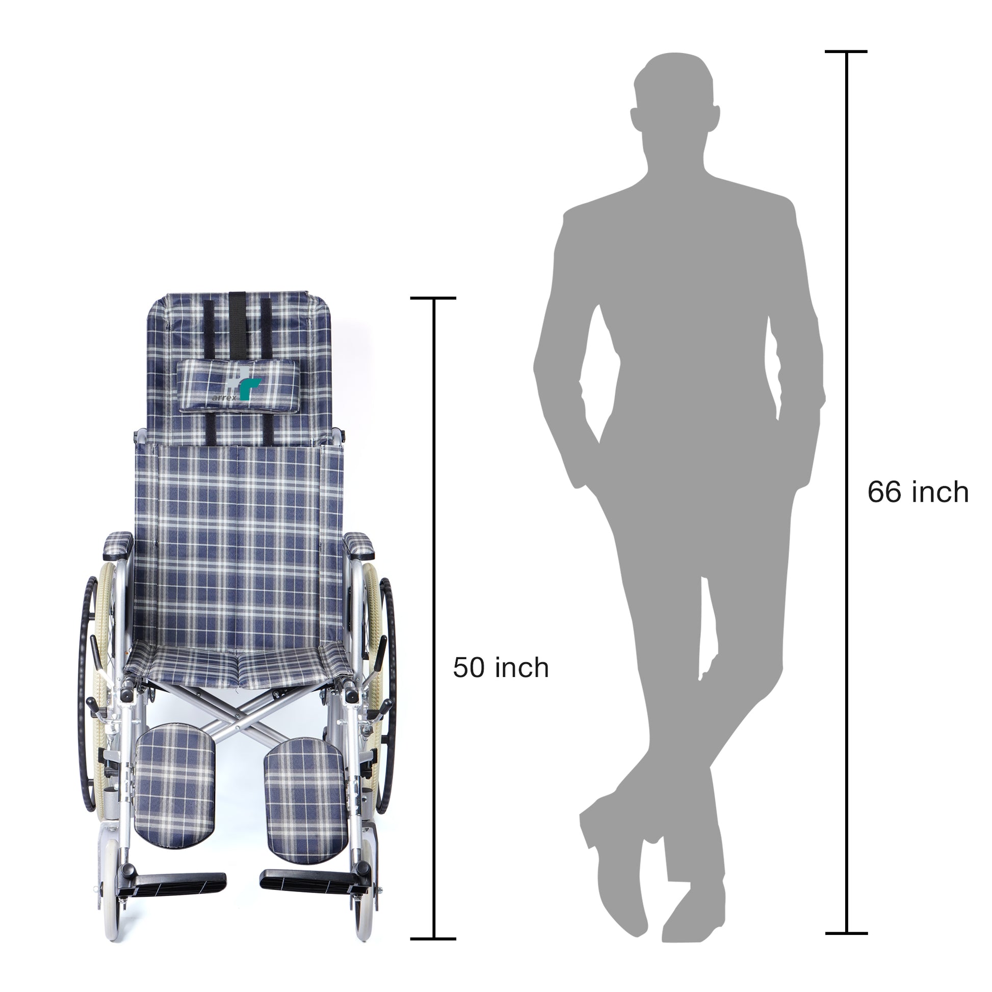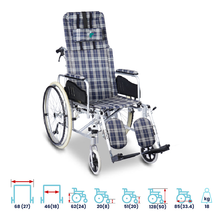 - The wheelchair features a reclining backrest, allowing users to adjust their seating position for added comfort.