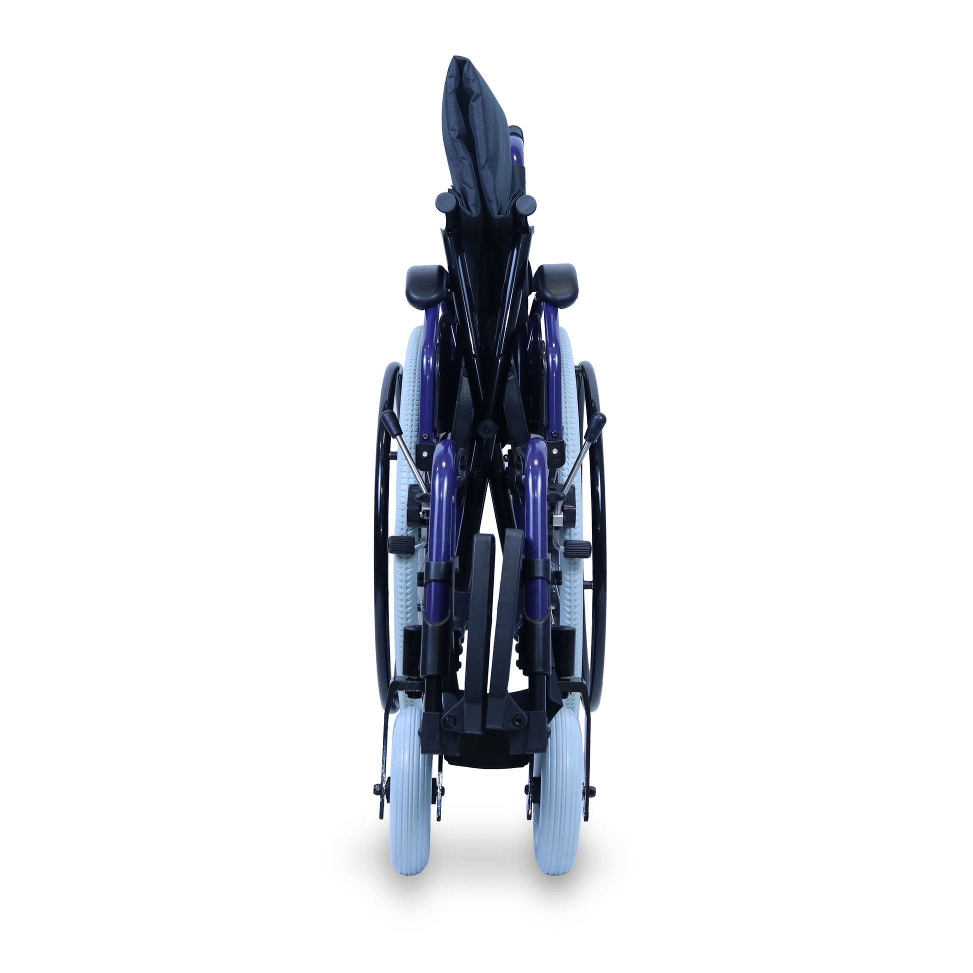 - The wheelchair is equipped with self-drive mag wheels, allowing users to independently propel themselves.
