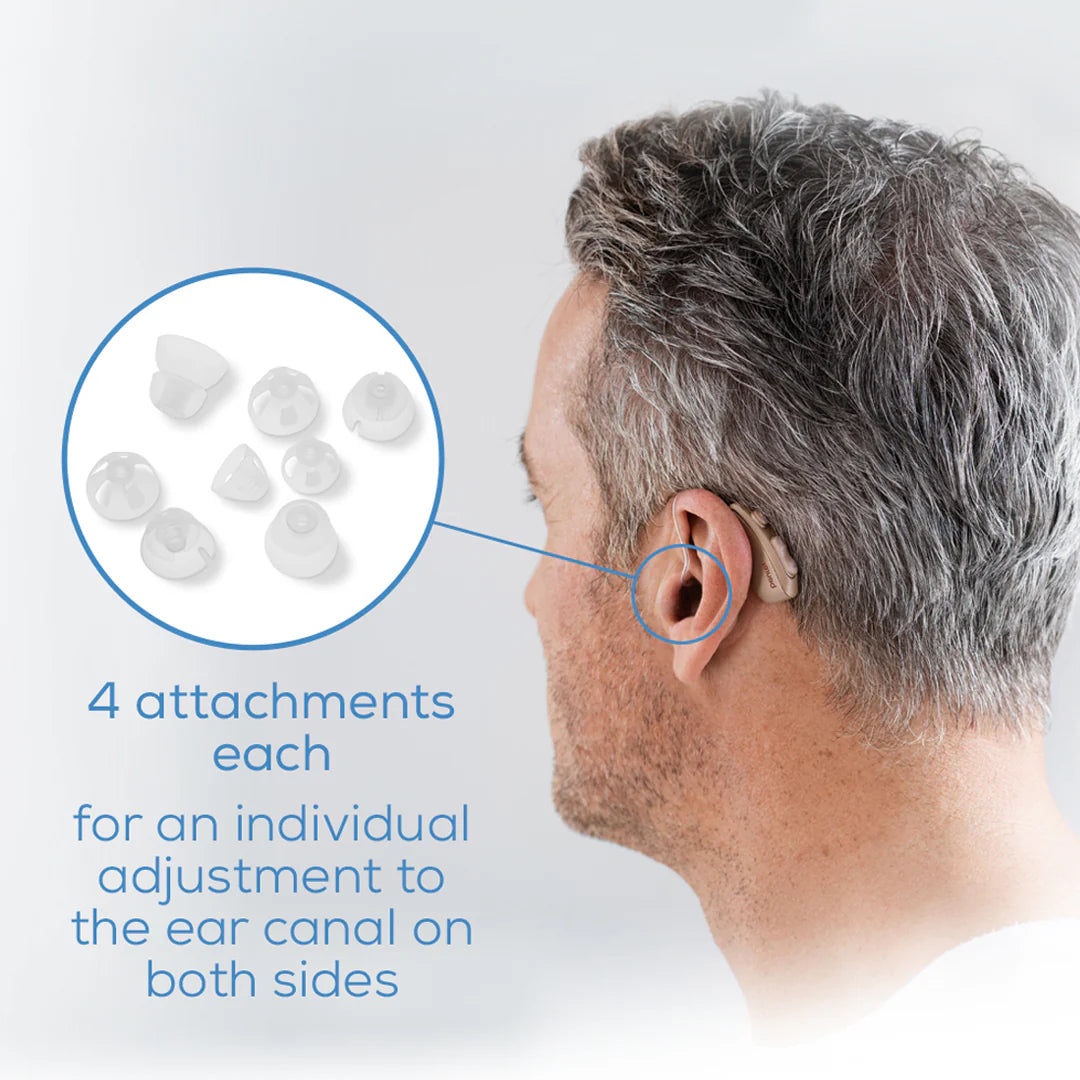 - Rechargeable hearing amplifiers with up to 10 hours of battery life
