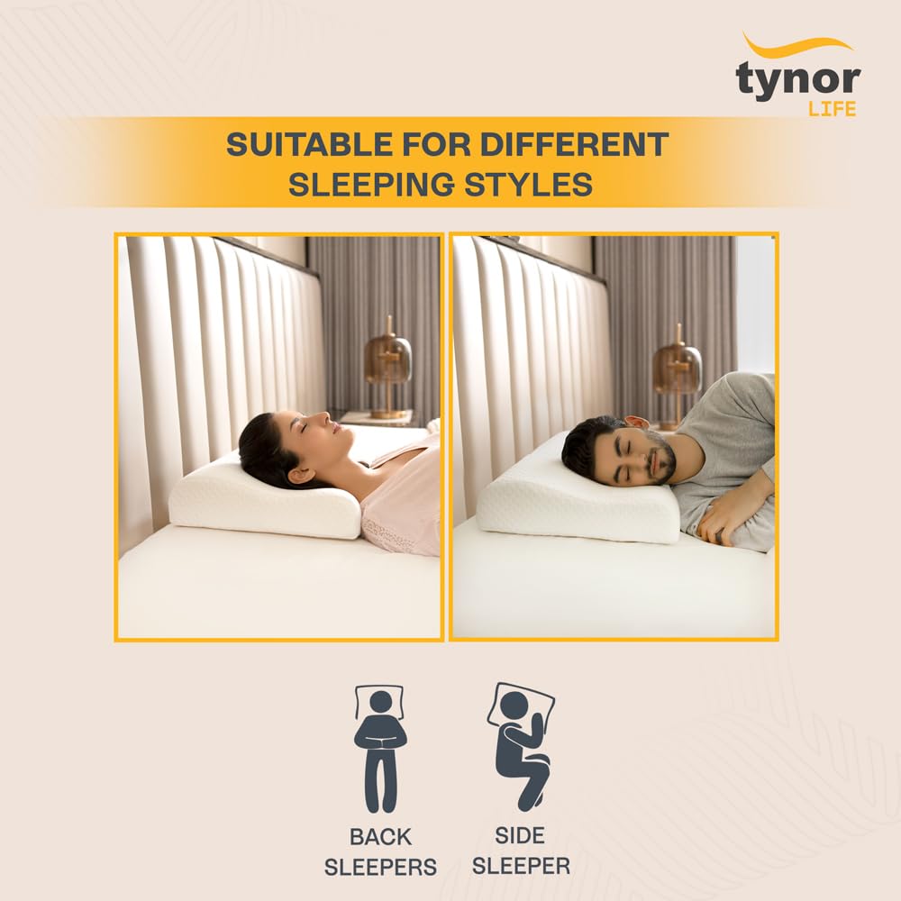Tynor Contoured cervical pillow- Memory Foam is anatomically shaped and designed to support the cervical spine in neutral position during sleep. Contoured Cervical Pillow keeps the neck in slightly hyper extension position while sleeping. This counters the stress and strain of the day by relaxing the muscles, where we tend to keep the neck in the opposite ?Flexion? position. It cures the cervical problems while we sleep. Corrects the sleeping posture and straightens the spine