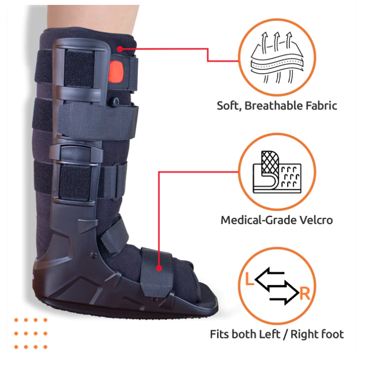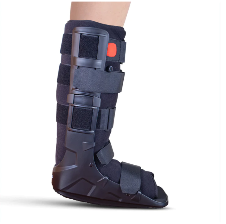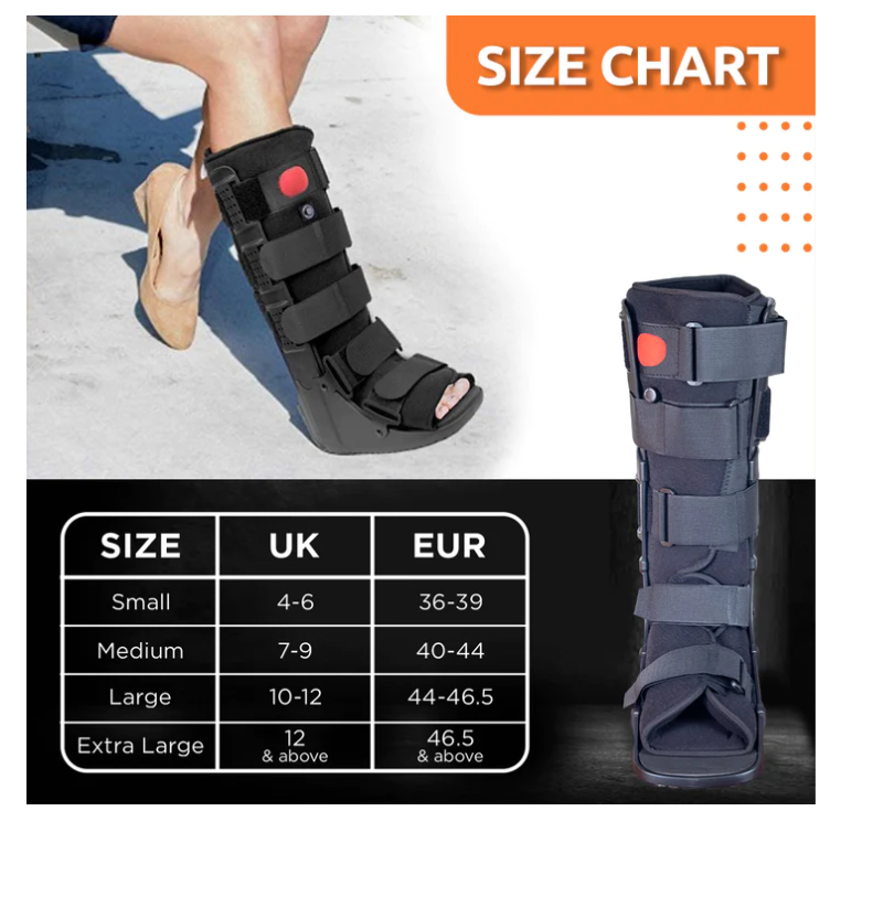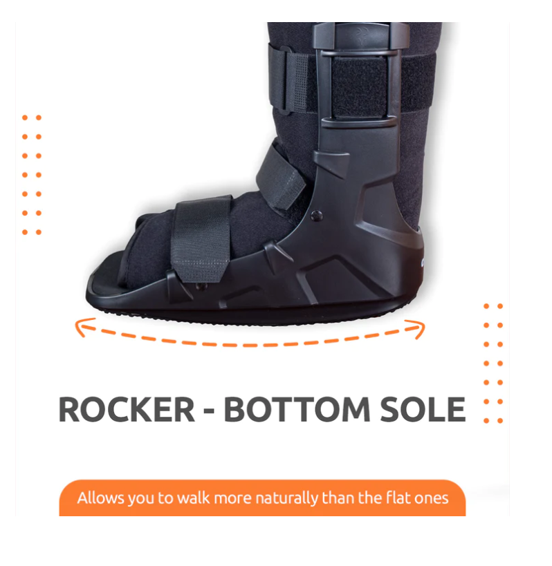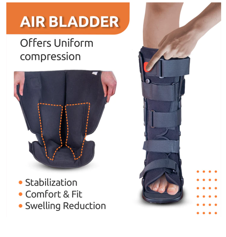 The Pneumatic Walker Boot provides maximum support and stability to the ankle and is light weight and durable. Its Rocker sole design promotes natural walking and its unique shock absorbing sole reduces impact of heel strike during ambulation. The Front panel with inflated air cell provides complete protection and support. It helps in pressure offloading and enhances blood flow. The Double air valve offers pneumatic compression to promote callus formation over fracture site and reduce swelling, and the inflation can be customized to desired compression level with the air valve. The detachable soft cushion provides a comfortable perfect fit.